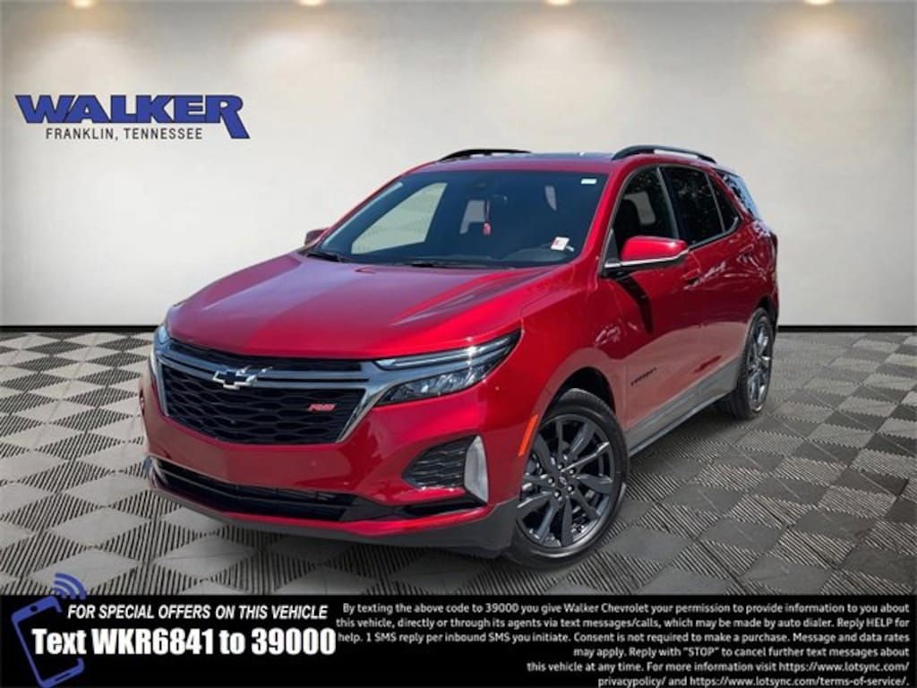 Equinox RS, 4D Sport Utility, 1.5L DOHC, 6-Speed Automatic Electronic with Overdrive, FWD, Radiant Red Tintcoat, Jet Black Leather, 120-Volt Power Outlet, 19 Aluminum Wheels, 2 Rear USB Charging-Only Ports, 2 USB Data Ports, 2 USB Data Ports w/SD Card Reader, 2 USB Ports & Auxiliary Input Jack, 2-Way Power Driver Lumbar Control Seat Adjuster, 3.50 Final Drive Axle Ratio, 4-Wheel Disc Brakes, 6 Speakers, 6-Speaker Audio System Feature, ABS brakes, Adaptive Cruise Control, Advanced Safety Package, Air Conditioning, Alloy wheels, AM/FM radio: SiriusXM, Auto High-beam Headlights, Automatic temperature control, Bluetooth® For Phone, Bose Premium 7-Speaker Audio System Feature, Brake assist, Bumpers: body-color, Compass, Delay-off headlights, Driver 8-Way Power Seat Adjuster, Driver door bin, Driver Seatback Map Pocket, Driver vanity mirror, Dual front impact airbags, Dual front side impact airbags, Electronic Stability Control, Emergency communication system: OnStar and Chevrolet connected services capable, Four wheel independent suspension, Front anti-roll bar, Front Bucket Seats, Front Center Armrest, Front dual zone A/C, Front Passenger 4-Way Manual Seat Adjuster, Front reading lights, Fully automatic headlights, HD Surround Vision, Heated door mirrors, Heated Driver & Front Passenger Seats, Heated front seats, Heated Steering Wheel, Illuminated entry, Infotainment Package, Low tire pressure warning, Occupant sensing airbag, Outside Heated Power-Adjustable Mirrors, Outside temperature display, Overhead airbag, Overhead console, Panic alarm, Passenger door bin, Passenger vanity mirror, Perforated Leather-Appointed Seat Trim, Power door mirrors, Power driver seat, Power Liftgate, Power steering, Power Sunroof, Power windows, Preferred Equipment Group 1RS, Premium audio system: Chevrolet Infotainment 3, Premium Cloth Seat Trim, Radio data system, Radio: Chevrolet Infotainment 3 Plus System, Radio: Chevrolet Infotainment 3 Plus System w/Navi, Radio: Chevrolet Infotainment 3 System w/AM/FM, Rear anti-roll bar, Rear reading lights, Rear seat center armrest, Rear window defroster, Rear window wiper, Remote keyless entry, Roof rack: rails only, RS Leather Package, Safety & Infotainment Package, Security system, SiriusXM Radio, Speed control, Speed-sensing steering, Split folding rear seat, Spoiler, Steering wheel mounted audio controls, Tachometer, Telescoping steering wheel, Tilt steering wheel, Traction control, Trip computer, Variably intermittent wipers, Wireless Apple CarPlay/Wireless Android Auto.2023 Chevrolet Equinox RS 4D Sport Utility FWD 6-Speed Automatic Electronic with Overdrive Radiant Red Tintcoat Odometer is 7912 miles below market average!Chevrolet Certified Pre-Owned Details:* Vehicle History* Warranty Deductible: $0* Powertrain Limited Warranty: 72 Month/100,000 Mile (whichever comes first) from original in-service date* 24 months/24,000 miles (whichever comes first) Certified Pre-Owned Scheduled Maintenance Plan and 3 days/150 miles (whichever comes first) Vehicle Exchange Program. SiriusXM 3-month trial subscription.* Transferable Warranty* 172 Point Inspection* Roadside Assistance* Limited Warranty: 12 Month/12,000 Mile (whichever comes first) from certified purchase dateTax, title, license, and dealer fee of $789 (unless itemized above) are extra.Come see the friendly staff at Walker Chevrolet in Franklin. We'll work with you to make sure you get the right vehicle for your needs and your budget. Walker Chevrolet takes pride in being a part of the Middle-Tennessee community and we've been working hard to earn and keep the trust of our customers since 1926. Look no further than Walker Chevrolet; your local, family-owned dealership, putting our relationship with the customer first. Call us today at (615) 591-6000 or visit us online at www.walkerchevrolet.com.