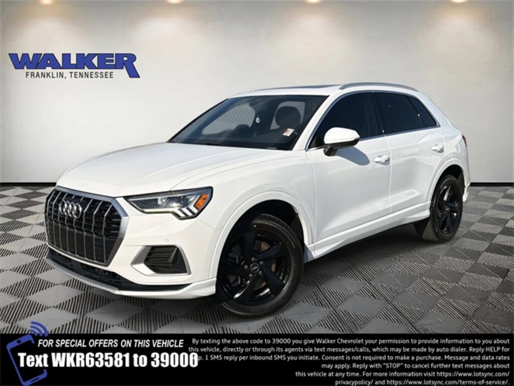 Q3 Premium Plus quattro, 4D Sport Utility, 2.0L 4-Cylinder TFSI, 8-Speed Automatic with Tiptronic, quattro, Ibis White, Brown Leather, 10 Speakers, 3.533 Axle Ratio, 4-Wheel Disc Brakes, 8-Way Power Driver & Passenger Seat, ABS brakes, Air Conditioning, Alarm w/Motion Sensor, Alloy wheels, Aluminum Spectrum Inlays, AM/FM radio, Audi Advanced Key, Audi Beam-Rings, Audi Parking System Plus, Audi Phone Box w/Wireless Charging, Audi Side Assist, Audi smartphone interface (Apple CarPlay/Android Auto), Auto High-beam Headlights, Auto-Dimming Rear-View Mirror w/Compass, Automatic temperature control, Brake assist, Bumpers: body-color, Convenience Package, Delay-off headlights, Driver door bin, Driver vanity mirror, Dual front impact airbags, Dual front side impact airbags, Electronic Stability Control, Exterior Parking Camera Rear, Four wheel independent suspension, Front anti-roll bar, Front Bucket Seats, Front Center Armrest, Front dual zone A/C, Front fog lights, Front reading lights, Full LED Headlights w/Unique DRL Signature, Fully automatic headlights, Heated door mirrors, Heated Front Bucket Seats, Heated front seats, HomeLink Garage Door Opener, Illuminated entry, Interior Protection Kit, Knee airbag, Leather Seating Surfaces, Leather Shift Knob, Leather steering wheel, LED Interior Lighting, Low tire pressure warning, Occupant sensing airbag, Outside temperature display, Overhead airbag, Overhead console, Panic alarm, Passenger door bin, Passenger vanity mirror, Power door mirrors, Power driver seat, Power Liftgate, Power moonroof, Power steering, Power windows, Premium Plus Package, Radio data system, Radio: Audi Sound System, Rain sensing wipers, Rear air conditioning, Rear anti-roll bar, Rear fog lights, Rear reading lights, Rear seat center armrest, Rear Side Airbags, Rear window defroster, Rear window wiper, Remote keyless entry, SiriusXM All Access Service, Speed control, Speed-sensing steering, Split folding rear seat, Spoiler, Steering wheel mounted audio controls, Tachometer, Telescoping steering wheel, Tilt steering wheel, Traction control, Trip computer, Turn signal indicator mirrors, Variably intermittent wipers, Wheels: 18 5-Arm Design.2020 Audi Q3 Premium Plus quattro 4D Sport Utility quattro 8-Speed Automatic with Tiptronic Ibis WhiteTax, title, license, and dealer fee of $789 (unless itemized above) are extra.Come see the friendly staff at Walker Chevrolet in Franklin. We'll work with you to make sure you get the right vehicle for your needs and your budget. Walker Chevrolet takes pride in being a part of the Middle-Tennessee community and we've been working hard to earn and keep the trust of our customers since 1926. Look no further than Walker Chevrolet; your local, family-owned dealership, putting our relationship with the customer first. Call us today at (615) 591-6000 or visit us online at www.walkerchevrolet.com.