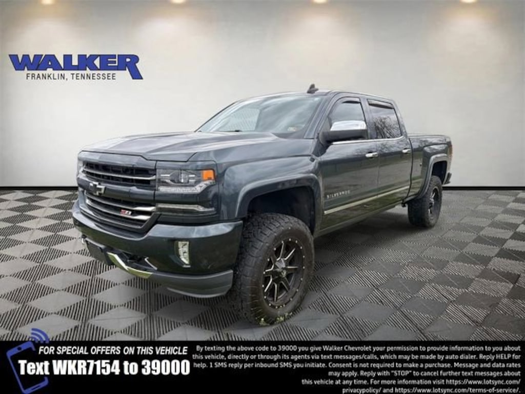 Silverado 1500 LTZ 2LZ, 4D Crew Cab, EcoTec3 5.3L V8, 8-Speed Automatic with Overdrive, 4WD, Graphite Metallic, Dark Ash With Jet Black Interior Accents Leather, 110-Volt AC Power Outlet, 150 Amp Alternator, 3.42 Rear Axle Ratio, 4-Wheel Disc Brakes, 4.2 Diagonal Color Display Driver Info Center, 40/20/40 Front Split Bench Seat, 6 Speaker Audio System, 6 Speakers, 6 Rectangular Chromed Tubular Assist Steps (LPO), ABS brakes, Air Conditioning, Alloy wheels, AM/FM radio: SiriusXM, Auto-dimming door mirrors, Auto-Dimming Inside Rear-View Mirror, Auto-dimming Rear-View mirror, Automatic temperature control, Auxiliary External Transmission Oil Cooler, Bluetooth® For Phone, Bodyside moldings, Brake assist, CD player, Chrome Bodyside Moldings, Chrome Cap Power-Adjustable Heated Outside Mirrors, Chrome Door Handles, Chrome Mirror Caps, Color-Keyed Carpeting w/Rubberized Vinyl Floor Mats, Compass, Deep-Tinted Glass, Delay-off headlights, Driver & Front Passenger Illuminated Vanity Mirrors, Driver door bin, Driver vanity mirror, Dual front impact airbags, Dual front side impact airbags, Dual-Zone Automatic Climate Control, Electric Rear-Window Defogger, Electronic Stability Control, Emergency communication system: OnStar Guidance, Exterior Parking Camera Rear, EZ Lift & Lower Tailgate, Floor Mounted Console, Front anti-roll bar, Front Center Armrest w/Storage, Front Chrome Bumper, Front dual zone A/C, Front fog lights, Front Frame-Mounted Black Recovery Hooks, Front Full Feature Power Reclining Bucket Seats, Front reading lights, Front wheel independent suspension, Fully automatic headlights, Garage door transmitter, HD Radio, Heated & Vented Front Seating, Heated door mirrors, Heated Driver & Front Passenger Seats, Heated front seats, Heavy-Duty Rear Locking Differential, Illuminated entry, Leather Appointed Seat Trim, Leather Wrapped Steering Wheel w/Cruise Controls, LED Cargo Box Lighting, LED Taillamps w/Signature, Low tire pressure warning, Manual Tilt/Telescoping Steering Column, Memory seat, Occupant sensing airbag, OnStar 3 Months Guidance Plan, OnStar w/4G LTE, Outside temperature display, Overhead airbag, Overhead console, Panic alarm, Passenger door bin, Passenger vanity mirror, Power door mirrors, Power driver seat, Power passenger seat, Power Sliding Rear Window, Power steering, Power Sunroof, Power windows, Power Windows w/Driver Express Up, Premium audio system: Chevrolet MyLink, Radio data system, Radio: AM/FM 8 Diagonal Clr Touch Nav, Radio: AM/FM 8 Diagonal Color Touch Screen, Rear 60/40 Folding Bench Seat (Folds Up), Rear Chrome Bumper, Rear reading lights, Rear seat center armrest, Rear step bumper, Rear Vision Camera, Rear Wheelhouse Liners, Rear window defroster, Remote Keyless Entry, Remote keyless entry, Remote Locking Tailgate, Remote Vehicle Starter System, Security system, Single Slot CD/MP3 Player, SiriusXM Satellite Radio, Speed control, Speed-sensing steering, Split folding rear seat, Spray-On Pickup Box Bed Liner, Steering Wheel Audio Controls, Steering wheel mounted audio controls, Tachometer, Telescoping steering wheel, Theft Deterrent System (Unauthorized Entry), Thin Profile LED Fog Lamps, Tilt steering wheel, Traction control, Trailering Package, Tri-Fold Soft Tonneau Cover (LPO), Trip computer, Turn signal indicator mirrors, Universal Home Remote, Variably intermittent wipers, Voltmeter, Wireless Charging.2017 Chevrolet Silverado 1500 LTZ 2LZ 4D Crew Cab 4WD 8-Speed Automatic with Overdrive Graphite Metallic Odometer is 56284 miles below market average!Tax, title, license, and dealer fee of $789 (unless itemized above) are extra.Come see the friendly staff at Walker Chevrolet in Franklin. We'll work with you to make sure you get the right vehicle for your needs and your budget. Walker Chevrolet takes pride in being a part of the Middle-Tennessee community and we've been working hard to earn and keep the trust of our customers since 1926. Look no further than Walker Ch