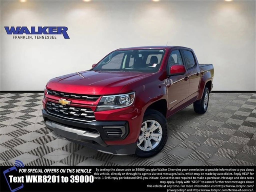 Colorado LT, 4D Crew Cab, V6, 8-Speed Automatic, 4WD, Cherry Red Tintcoat, Black Cloth, 3.42 Rear Axle Ratio, 4-Wheel Disc Brakes, 6 Speakers, 6-Speaker Audio System Feature, ABS brakes, Air Conditioning, Alloy wheels, AM/FM radio: SiriusXM, Apple CarPlay/Android Auto, Auto-dimming Rear-View mirror, Bumpers: body-color, Cloth Seat Trim, Compass, Delay-off headlights, Driver 6-Way Power Seat Adjuster, Driver door bin, Driver vanity mirror, Dual front impact airbags, Dual front side impact airbags, Electronic Stability Control, Enhanced Driver Instrument Information Display, Exterior Parking Camera Rear, Front anti-roll bar, Front Bucket Seats, Front Center Armrest, Front reading lights, Front wheel independent suspension, Fully automatic headlights, Illuminated entry, Low tire pressure warning, Occupant sensing airbag, Outside temperature display, Overhead airbag, Overhead console, Panic alarm, Passenger door bin, Passenger vanity mirror, Power door mirrors, Power driver seat, Power steering, Power windows, Preferred Equipment Group 4LT, Premium audio system: Chevrolet Infotainment 3, Radio data system, Radio: Chevrolet Infotainment 3 System, Rear reading lights, Rear seat center armrest, Rear step bumper, Rear Vision Camera, Remote keyless entry, Security system, SiriusXM Radio, Speed control, Speed-sensing steering, Steering wheel mounted audio controls, Tachometer, Telescoping steering wheel, Tilt steering wheel, Traction control, Trip computer, Variably intermittent wipers.2021 Chevrolet Colorado LT 4D Crew Cab 4WD 8-Speed Automatic Cherry Red TintcoatTax, title, license, and dealer fee of $789 (unless itemized above) are extra.Come see the friendly staff at Walker Chevrolet in Franklin. We'll work with you to make sure you get the right vehicle for your needs and your budget. Walker Chevrolet takes pride in being a part of the Middle-Tennessee community and we've been working hard to earn and keep the trust of our customers since 1926. Look no further than Walker Chevrolet; your local, family-owned dealership, putting our relationship with the customer first. Call us today at (615) 591-6000 or visit us online at www.walkerchevrolet.com.