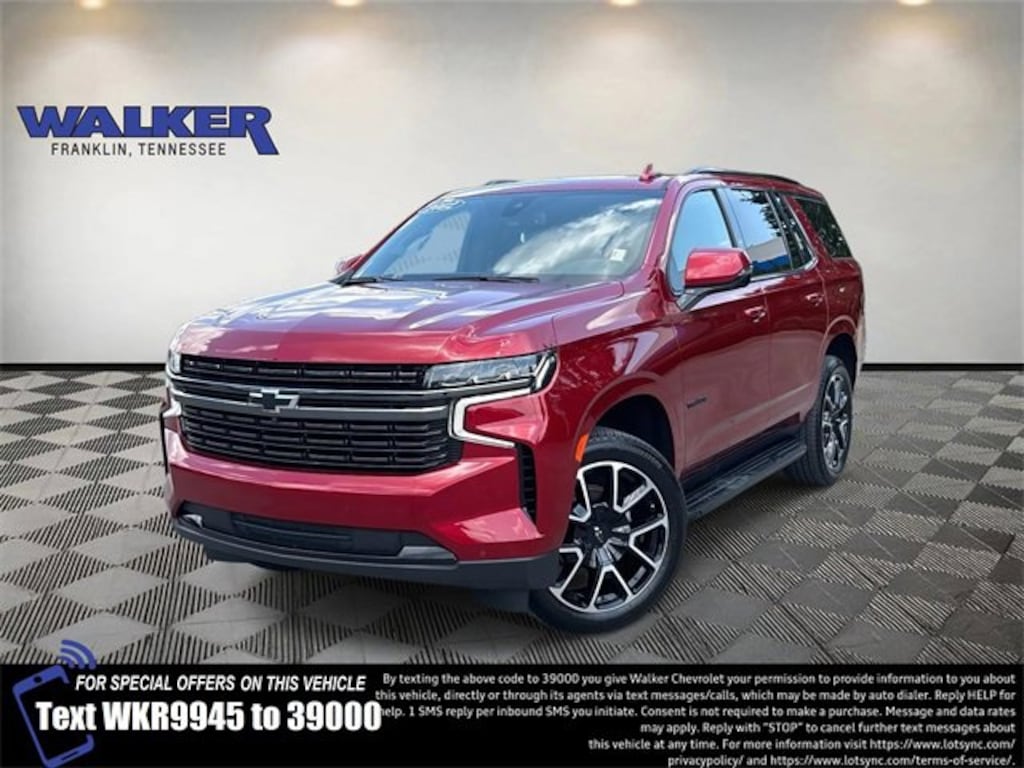 Tahoe RST, 4D Sport Utility, EcoTec3 5.3L V8, 10-Speed Automatic with Overdrive, 4WD, Cherry Red Tintcoat, Jet Black/Victory Red Leather, 10-Way Power Driver & Passenger Seat Adjusters, 1st & 2nd Row Color-Keyed Carpeted Floor Mats, 2nd Row Pwr Release 60/40 Split-Folding Bench Seat, 3.23 Rear Axle Ratio, 3rd Row 60/40 Power-Folding Split-Bench Seat, 3rd row seats: split-bench, 4-Wheel Disc Brakes, 9 Speakers, ABS brakes, Air Conditioning, Alloy wheels, AM/FM radio: SiriusXM with 360L, Apple CarPlay/Android Auto, Auto High-beam Headlights, Auto-Dimming Inside Rear-View Mirror, Auto-dimming Rear-View mirror, Automatic Stop/Start, Automatic temperature control, Bose 9-Speaker Stereo Audio System Feature, Brake assist, Bright Front & Rear Door Sill Plates, Bumpers: body-color, Color-Keyed Carpeting Floor Covering, Compass, Delay-off headlights, Driver & Front Outboard Passenger Airbags, Driver Alert Package, Driver door bin, Driver vanity mirror, Dual front impact airbags, Dual front side impact airbags, Dual-Pane Power Panoramic Sunroof, Electronic Stability Control, Emergency communication system: OnStar and Chevrolet connected services capable, Enhanced Driver Information Center, Floor Console w/Storage Area, Four wheel independent suspension, Front anti-roll bar, Front Bucket Seats, Front Center Armrest, Front dual zone A/C, Front High-Back Reclining Bucket Seats, Front reading lights, Fully automatic headlights, Garage door transmitter, Hands-Free Rear Power Programmable Liftgate, HD Surround Vision, Heated 2nd Row Outboard Seats, Heated door mirrors, Heated Driver & Front Passenger Seats, Heated front seats, Heated Steering Wheel, Illuminated entry, Infotainment Display, Lane Change Alert w/Side Blind Zone Alert, Leather steering wheel, Leather-Wrapped Steering Wheel, LED Daytime Running Lamps, Low tire pressure warning, Luxury Package, Memory seat, Memory Settings, Memory Settings for Driver, Navigation System, Not Equipped w/Steering Column Lock, Occupant sensing airbag, Outside Heated Power-Adjustable Mirrors, Outside temperature display, Overhead airbag, Overhead console, Panic alarm, Passenger door bin, Passenger vanity mirror, Perforated Leather Seat Trim, Power door mirrors, Power driver seat, Power Liftgate, Power passenger seat, Power Release 2nd Row Bucket Seats, Power steering, Power Tilt & Telescopic Steering Column, Power windows, Preferred Equipment Group 1SP, Premium audio system: Chevrolet Infotainment System 3, Premium Smooth Ride Suspension, Radio: Chevrolet Infotainment 3 Premium System, Rain sensing wipers, Rear air conditioning, Rear anti-roll bar, Rear Cross Traffic Alert, Rear Pedestrian Alert, Rear reading lights, Rear seat center armrest, Rear window defroster, Rear window wiper, Remote keyless entry, Remote Start, Roof rack: rails only, Security system, Set of 4 Wheel Locks (LPO), SiriusXM Radio w/360L, Speed control, Speed-sensing steering, Split folding rear seat, Spoiler, Start/Stop System Disable Button, Steering wheel mounted audio controls, Tachometer, Telescoping steering wheel, Tilt steering wheel, Traction control, Trip computer, Universal Home Remote, Variably intermittent wipers, Voltmeter, Wheels: 22 x 9 Bright Machined, Wireless Charging.
