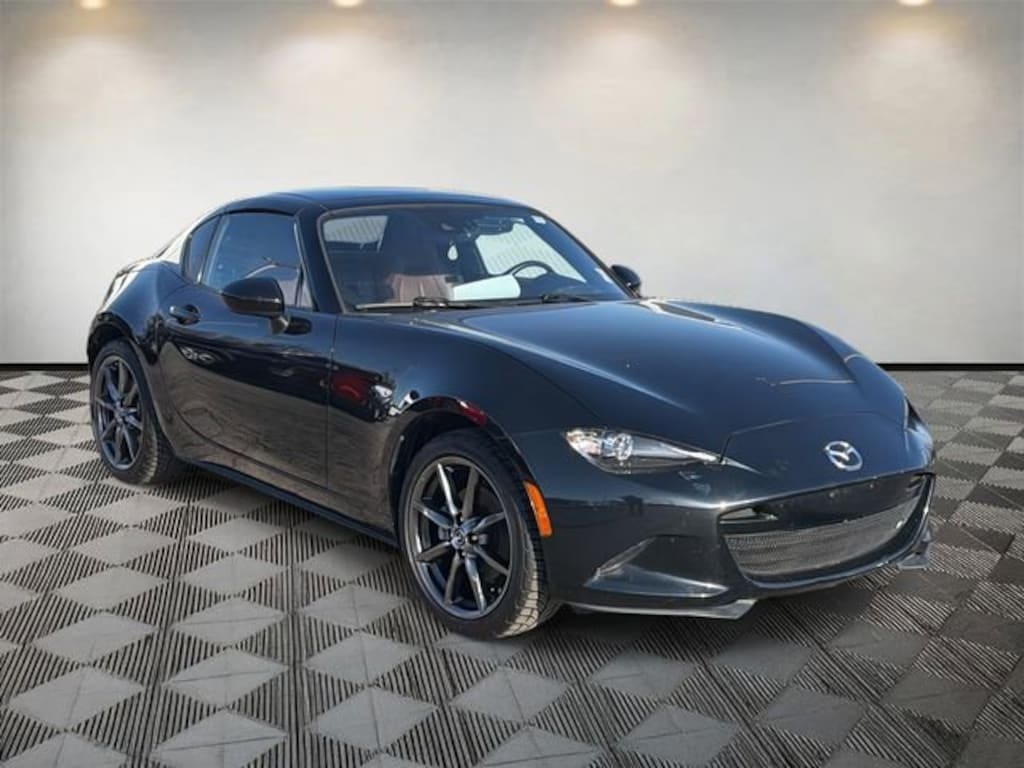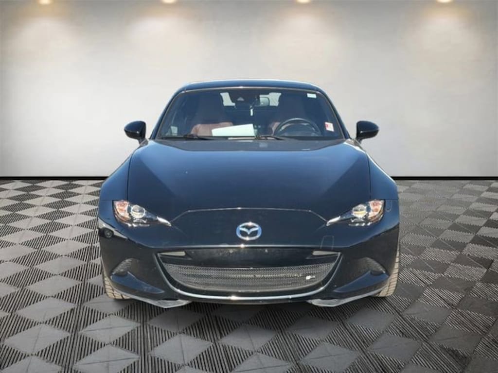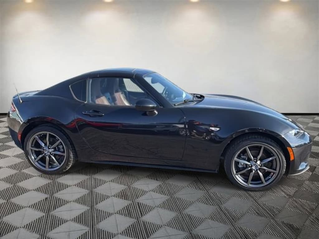Miata RF Grand Touring, 2D Convertible, I4, 6-Speed Automatic Sport, RWD, Jet Black Mica, Auburn Leather, 4-Wheel Disc Brakes, 9 Speakers, ABS brakes, Air Conditioning, Alloy wheels, AM/FM radio: SiriusXM, AM/FM Sound System w/Navigation, Auto High-beam Headlights, Auto-dimming door mirrors, Auto-dimming Rear-View mirror, Automatic temperature control, BOSE Audio System, Brake assist, Bumpers: body-color, Convertible HardTop, Convertible roof lining, Convertible roof wind blocker, Delay-off headlights, Driver vanity mirror, Dual front impact airbags, Dual front side impact airbags, Electronic Stability Control, Emergency communication system: MAZDA CONNECT, Exterior Parking Camera Rear, Four wheel independent suspension, Front anti-roll bar, Front Bucket Seats, Front Center Armrest, Fully automatic headlights, Garage door transmitter: HomeLink, Glass rear window, Heated door mirrors, Heated front seats, Illuminated entry, Leather Shift Knob, Leather Upholstery, Low tire pressure warning, MAZDA CONNECT Infotainment System, Navigation System, Occupant sensing airbag, Outside temperature display, Panic alarm, Passenger vanity mirror, Power convertible roof, Power door mirrors, Power steering, Power windows, Radio data system, Rain sensing wipers, Rear anti-roll bar, Rear window defroster, Reclining Heated Front Bucket Seats, Remote keyless entry, Speed control, Speed-sensing steering, Sport steering wheel, Steering wheel mounted audio controls, Tachometer, Telescoping steering wheel, Tilt steering wheel, Traction control, Trip computer, Variably intermittent wipers, Wheel Locks - 17mm (DISC), Wheels: 17" x 7" Dark Silver Aluminum Alloy.