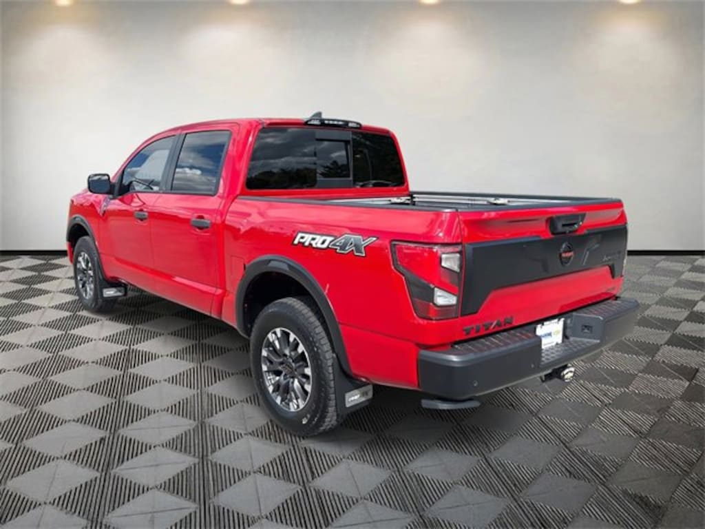 Titan PRO-4X, 4D Crew Cab, 5.6L V8 DOHC 32V 400hp, 9-Speed Automatic, 4WD, Red Alert, Black Vinyl, 120V Outlet in Bed, 3.69 Axle Ratio, 4-Wheel Disc Brakes, 6 Speakers, ABS brakes, Air Conditioning, Alloy wheels, AM/FM radio: SiriusXM, Auto High-beam Headlights, Auto-dimming Rear-View mirror, Auto-leveling suspension, Automatic temperature control, Bed Assist Grip, Blind Spot Warning, Brake assist, Cloth Seat Trim w/Vinyl Bolsters, Compass, Delay-off headlights, Driver door bin, Driver vanity mirror, Dual front impact airbags, Dual front side impact airbags, Electronic Locking Tailgate, Electronic Stability Control, Electronic Tailgate Lock Deletion, Emergency communication system: NissanConnect Services, Fender Premium Audio System w/12 Speakers, Front & Rear Parking Sensors, Front anti-roll bar, Front Bucket Seats, Front Captain's Seats, Front Center Armrest, Front dual zone A/C, Front fog lights, Front reading lights, Front wheel independent suspension, Fully automatic headlights, Garage door transmitter: HomeLink, Heated door mirrors, Illuminated entry, Knee airbag, Leather steering wheel, LED Tailgate Area Illumination, LED Under Rail Bed Lighting, Low tire pressure warning, Navigation system: NissanConnect Navigation, Nissan Tailgate Audio by Kicker, NissanConnect featuring Apple CarPlay and Android Auto, Occupant sensing airbag, Outside temperature display, Overhead airbag, Overhead console, Panic alarm, Passenger door bin, Passenger vanity mirror, Power door mirrors, Power driver seat, Power Sliding Rear Window w/Defogger, Power steering, Power windows, PRO-4X Badged Floor Mats, PRO-4X Illuminated Kick Plate, PRO-4X Mud Flaps, PRO-4X Utility Package, Proximity Activation, Radio data system, Radio: NissanConnect w/Navigation, Rain sensing wipers, Rear anti-roll bar, Rear Bumper Step w/Electronic Tailgate Lock, Rear Parking Sensors, Rear seat center armrest, Rear step bumper, Rear Utility Bed Step, Rear window defroster, Remote keyless entry, Security system, Speed control, Speed-sensing steering, Speed-Sensitive Wipers, Split folding rear seat, Steering wheel mounted audio controls, Tachometer, Telescoping steering wheel, Tilt steering wheel, Traction control, Trailer Brake Controller, Trailer Light Check Function On Key Fob, Trip computer, Utilitrack System w/4 Tie-Down Cleats, Variably intermittent wipers, Voltmeter, Wheels: 18 x 8 Painted Dark Finish Alloy.