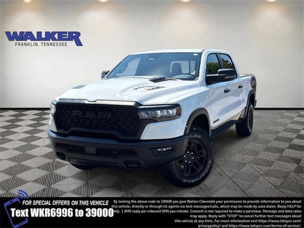 1500 Rebel, 4D Crew Cab, 3.0L I6, 8-Speed Automatic, 4WD, Bright White Clearcoat, Black Cloth, 10 Speakers, 3.92 Rear Axle Ratio, 4 Way Front Headrests, 4-Wheel Disc Brakes, 4G LTE Wi-Fi Hot Spot, ABS brakes, Air Conditioning, Alloy wheels, AM/FM radio: SiriusXM with 360L, Apple CarPlay, Apple CarPlay/Android Auto, Auto High-beam Headlights, Auto Power-Folding Mirrors, Auto-Dimming Exterior Driver Mirror, Auto-dimming Rear-View mirror, Automatic temperature control, Black Premium Power Mirrors, Brake assist, Bucket Seats, Cloth/Vinyl Bucket Seats, Compass, Connected Travel & Traffic Services, Connectivity - US/Canada, Convex Wide-Angle Exterior Mirror Insert, Delay-off headlights, Driver door bin, Driver vanity mirror, Dual front impact airbags, Dual front side impact airbags, Electronic Stability Control, Exterior Mirrors Courtesy Lamps, Exterior Mirrors w/Heating Element, Exterior Mirrors w/Supplemental Signals, Front anti-roll bar, Front Bucket Seats, Front Center Armrest w/Storage, Front dual zone A/C, Front fog lights, Front reading lights, Front Seat Back Map Pockets, Front wheel independent suspension, Full Length Upgraded Floor Console, Fully automatic headlights, Garage door transmitter, Google Android Auto, GPS Antenna Input, GPS Navigation, Heated door mirrors, Heated front seats, Heated steering wheel, Illuminated entry, Integrated Voice Command w/Bluetooth, Leather steering wheel, Low tire pressure warning, Manual Folding Exterior Mirrors, Manufacturer's Statement of Origin, Navigation System, Occupant sensing airbag, Outside temperature display, Overhead airbag, Overhead console, Panic alarm, ParkView Rear Back-Up Camera, Passenger door bin, Passenger vanity mirror, Power Adjust 8-Way Driver Seat, Power Adjustable Pedals, Power door mirrors, Power driver seat, Power steering, Power windows, Quick Order Package 21W Rebel, Radio data system, Radio: Uconnect 5 Nav w/12.0 Display, Rear 60/40 Folding Seat, Rear anti-roll bar, Rear seat center armrest, Rear step bumper, Rear Window Defroster, Rebel Level 1 Equipment Group, Remote keyless entry, Remote Tailgate Release, SiriusXM w/360L, Speed control, Split folding rear seat, Steering wheel mounted audio controls, Tachometer, Telescoping steering wheel, Tilt steering wheel, Traction control, Trip computer, USB Host Flip, Variably intermittent wipers, Voltmeter, Wheels: 18 x 8.0 Painted Mid-Gloss Black, Wireless Charging Pad.2025 Ram 1500 Rebel 4D Crew Cab 4WD 8-Speed Automatic Bright White ClearcoatTax, title, license, and dealer fee of $789 (unless itemized above) are extra.Come see the friendly staff at Walker Chevrolet in Franklin. We'll work with you to make sure you get the right vehicle for your needs and your budget. Walker Chevrolet takes pride in being a part of the Middle-Tennessee community and we've been working hard to earn and keep the trust of our customers since 1926. Look no further than Walker Chevrolet; your local, family-owned dealership, putting our relationship with the customer first. Call us today at (615) 591-6000 or visit us online at www.walkerchevrolet.com.